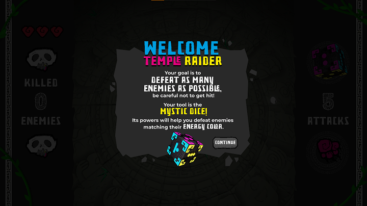 Welcome, temple raider! Your greed seems to finally pay off. Are you prepared to defend yourself from the horrendous temple criatures? Use the power of the magic dice and unleash amazing chromatic powers!